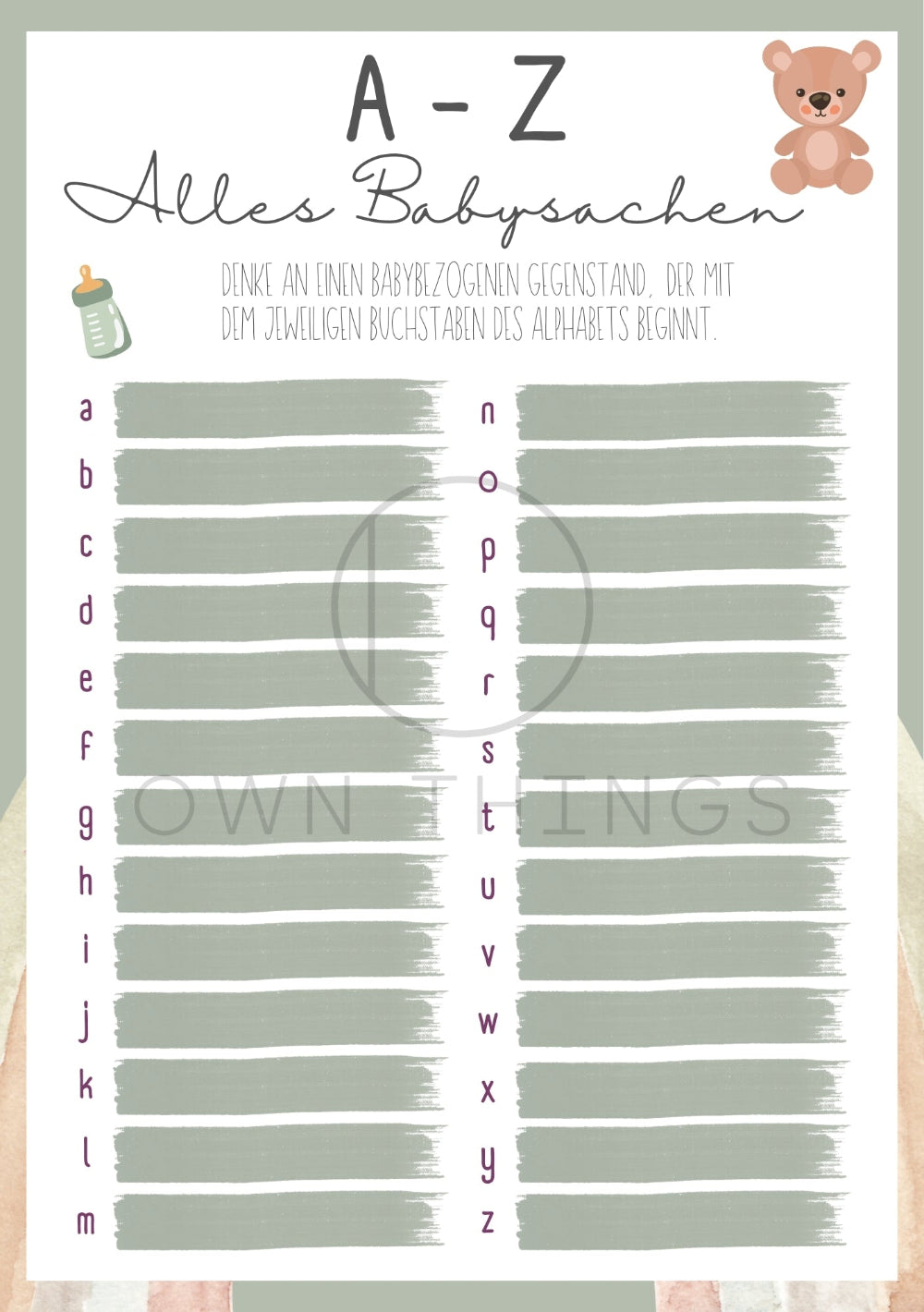 Sorge für jede Menge Spaß und gute Laune auf deiner nächsten Babyparty – mit unserem originellen A–Z Babyspiel!